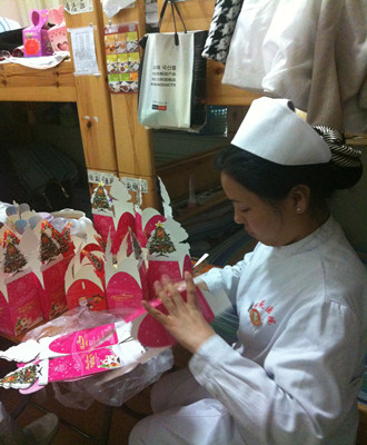 在主任和護(hù)士長(zhǎng)的帶領(lǐng)下,我們?cè)缭绲膩?lái)到科室,買來(lái)了精美的包裝,新鮮的蘋果,打算為每位患者送上我們的一份心意。