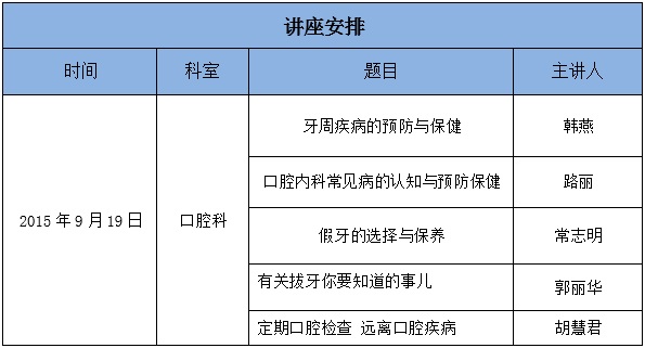 1989年確定每年9月20日為全國愛牙日,旨在廣泛動(dòng)員社會(huì)的力量,強(qiáng)化公眾對(duì)口腔衛(wèi)生的關(guān)注,普及口腔衛(wèi)生知識(shí)。使廣大群眾了解口腔疾病可防、可治。從而提高全民族的口腔健康水平。西苑醫(yī)院口腔科是集口腔內(nèi)科、口腔外科、口腔修復(fù)、口腔正畸等為一體的具有綜合功能的科室,科室擁有一流的口腔器械設(shè)備、先進(jìn)的消毒理念及高素質(zhì)的醫(yī)師隊(duì)伍。我科為慶祝第27個(gè)國際愛牙日的到來,將于2015年9月19日開展相關(guān)口腔保健知識(shí)講座及義診服務(wù),以使廣大群眾更好的了解口腔保健的重要性。
