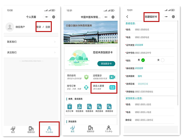 微信搜索中國中醫(yī)科學(xué)院西苑醫(yī)院小程序,點擊【個人中心】注冊賬號,首頁點擊【就診人管理】添加就診人,添加完成后即可到首頁進行預(yù)約掛號,就診當日無需現(xiàn)場建檔取號,小程序內(nèi)支付掛號費即可憑【電子號條】報到就診。