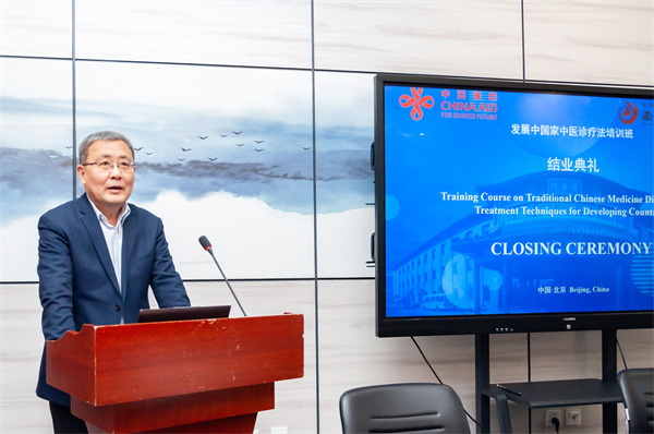 2023年12月20日,由商務(wù)部舉辦、中國(guó)中醫(yī)科學(xué)院西苑醫(yī)院承辦的發(fā)展中國(guó)家中醫(yī)診療法培訓(xùn)班圓滿結(jié)束,西苑醫(yī)院黨委書記張?jiān)蕩X出席結(jié)業(yè)典禮并致辭。來自巴基斯坦國(guó)家健康中心的衛(wèi)生官員薩拉姆·阿爾薩蘭·艾哈邁德(SALAM·ARSLAN AHMED)先生、突尼斯中醫(yī)學(xué)會(huì)高級(jí)傳統(tǒng)醫(yī)師本·阿姆拉·穆罕默德·哈利勒(BEN AMARA·MOHAMED KHALIL)先生作為學(xué)員代表發(fā)言。院辦主任付建華主持會(huì)議。