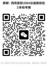 1.請(qǐng)后附名單中所有入圍體檢與考察的考生,于3月13日上午8:00前掃描下方二維碼加入微信群聊并查看群公告,群公告中會(huì)顯示體檢與考察的具體安排及注意事項(xiàng),逾期未加入群聊將視為自動(dòng)放棄體檢與考察和擬錄取資格。加入微信群聊后請(qǐng)將本人在群中昵稱(chēng)修改為“姓名+應(yīng)聘科室”格式,例:張三+骨傷科。