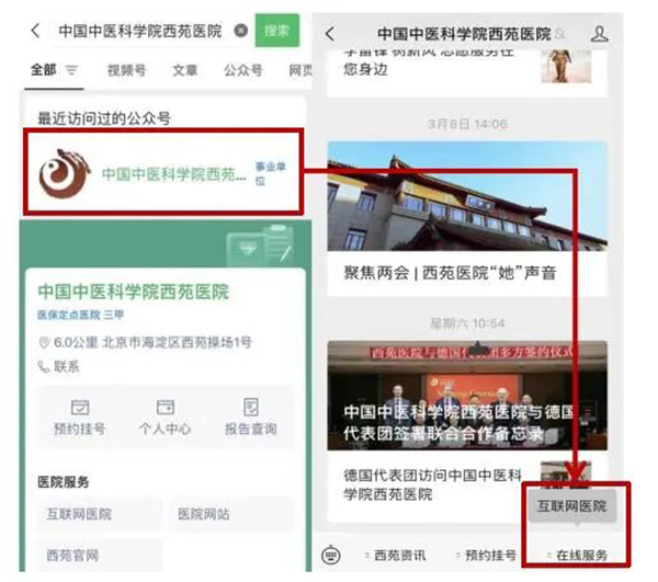 在微信中搜索“中國中醫(yī)科學(xué)院西苑醫(yī)院”,進(jìn)入公眾號頁面,點擊右下角“在線服務(wù)”進(jìn)入西苑醫(yī)院互聯(lián)網(wǎng)醫(yī)院小程序。