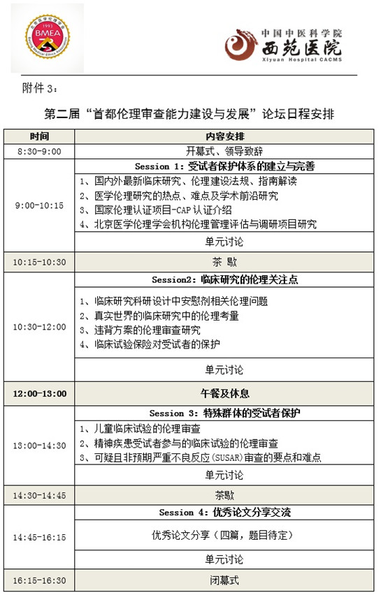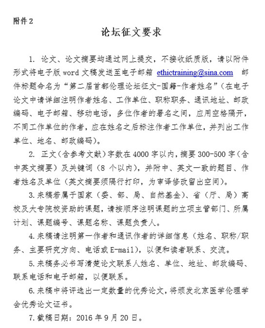 為促進北京地區(qū)人體研究倫理建設(shè),推動醫(yī)療衛(wèi)生機構(gòu)倫理建設(shè)整體工作,北京醫(yī)學倫理學會2015年10月召開了第一屆論壇并發(fā)布“北京地區(qū)醫(yī)療衛(wèi)生機構(gòu)人體研究倫理管理評估指標體系”。經(jīng)過北京醫(yī)學倫理學會一年多的努力推進,北京地區(qū)各醫(yī)療機構(gòu)積極踐行人體研究倫理管理的各項工作2016年第二屆論壇主題為“完善受試者保護運行機制,促進醫(yī)療機構(gòu)研究倫理管理”,下設(shè)若干議題進行討論。我們誠摯邀請在倫理管理、倫理審查、臨床研究的各屆同仁踴躍參會,并圍繞議題積極撰寫有一定學術(shù)價值和研究深度的論文投稿。本次會議將請業(yè)內(nèi)專家評選若干優(yōu)秀論文進行交流,同時將特邀國內(nèi)知名資深倫理管理專家就相關(guān)議題進行專題演講。希望北京醫(yī)學倫理學會學術(shù)論壇能持續(xù)為各醫(yī)療機構(gòu)在臨床研究國際化接軌和重大新藥創(chuàng)制平臺建設(shè)的實踐活動中,搭建交流學術(shù)思想和管理智慧的平臺。