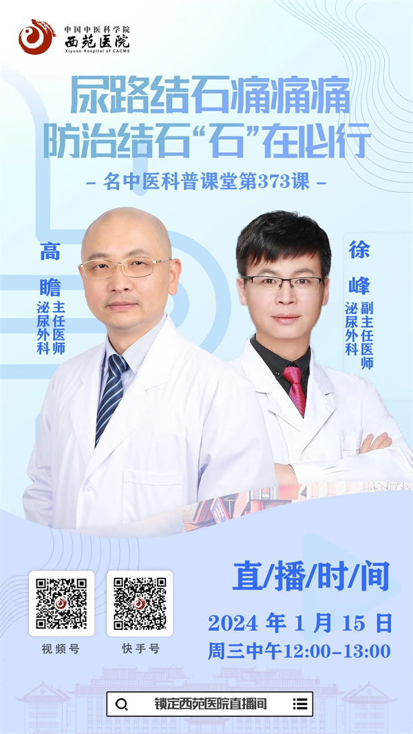 1月15日(周三)中午12:00,西苑醫(yī)院泌尿外科主任醫(yī)師高瞻、副主任醫(yī)師徐峰與大家交流互動、詳細解答。歡迎您預(yù)約并準(zhǔn)時收看直播!