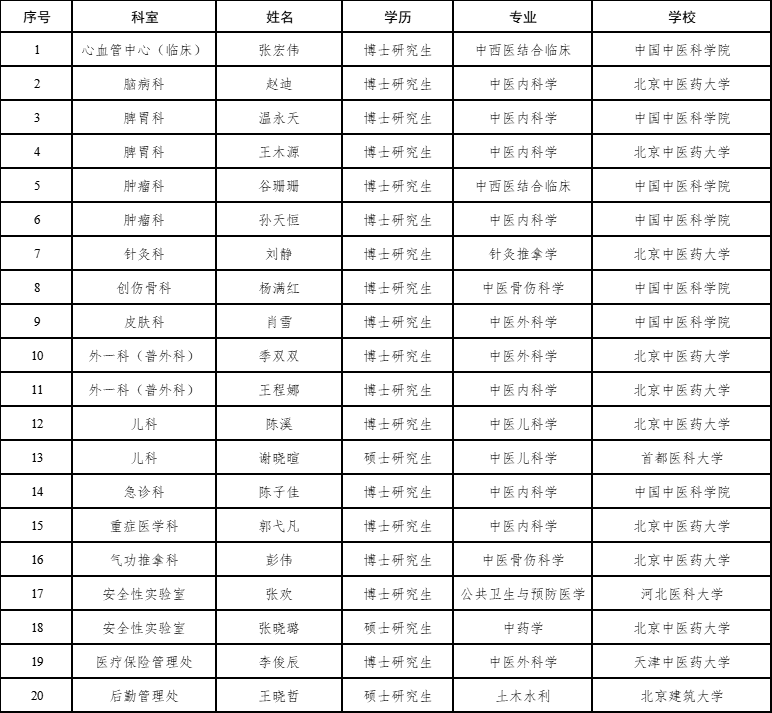 依據(jù)事業(yè)單位公開招聘工作有關(guān)規(guī)定,現(xiàn)將中國中醫(yī)科學(xué)院西苑醫(yī)院2025年擬聘用高校應(yīng)屆畢業(yè)生基本信息公示如下。公示期為5個(gè)工作日(2025年6月11日-6月17日),公示期間,如有問題,請向組織人事處或紀(jì)檢監(jiān)察處反映。