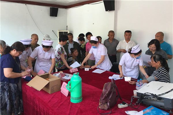 本次活動的內(nèi)容有:醫(yī)學(xué)診療、化驗(yàn)檢查、體質(zhì)辨識、健康咨詢、中醫(yī)技術(shù)體驗(yàn)、健康資料發(fā)放等。早晨7點(diǎn)30分,熱情高漲的村民們就早已在村委會排起長龍,翹首期盼醫(yī)護(hù)人員的到來。護(hù)理部委派5名具有豐富臨床經(jīng)驗(yàn)的護(hù)士組成小分隊(duì),早上6點(diǎn)出發(fā)先前到達(dá)義診地點(diǎn),為村民們采集血標(biāo)本,收集尿標(biāo)本。護(hù)士們精湛的抽血技術(shù)令村民們豎起大拇指,不到1個小時便完成135人次的血液標(biāo)本采集工作。