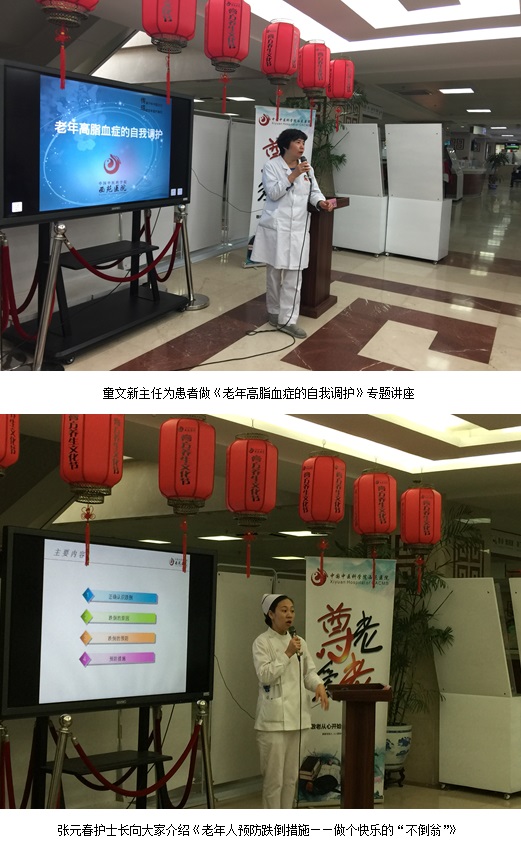 同時(shí)在健康大講堂上,由老年醫(yī)學(xué)研究所綜合內(nèi)科主任童文新主任醫(yī)師、老年病科副主任劉征堂主任醫(yī)師、老年病科張?jiān)鹤o(hù)士長(zhǎng),分別為廣大患者進(jìn)行了有關(guān)《老年高脂血癥的自我調(diào)護(hù)》、《老年骨質(zhì)疏松的防治》、《老年人預(yù)防跌倒措施——做個(gè)快樂的“不倒翁”》講座,各位專家圍繞老年人的血脂及骨質(zhì)疏松等方面進(jìn)行了通俗易懂、深入淺出的講解,受到廣大患者的歡迎及廣泛好評(píng)。