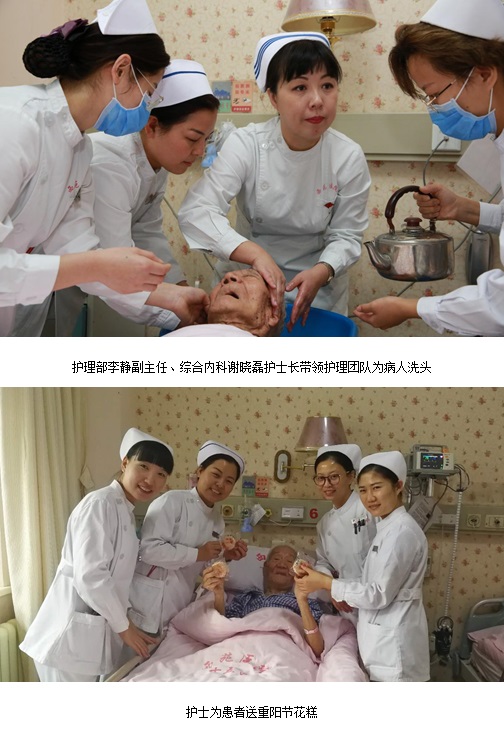 同時(shí),在病房,老年研究所的護(hù)理團(tuán)隊(duì)為長(zhǎng)期臥床的老年患者洗頭、剪指甲、打水、打飯、陪老人聊天,為他們提供生活上的照護(hù),并送去了節(jié)日祝福,送花糕、敬菊花茶等,感動(dòng)了病區(qū)的每一個(gè)患者。