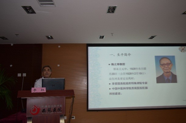 陳之寒教授的弟子,原肛腸科主任李權(quán)教授,做了《陳之寒教授學(xué)術(shù)思想與傳承》的專題學(xué)術(shù)報(bào)告,緬懷陳老為中醫(yī)肛腸事業(yè)不懈努力,做出卓越貢獻(xiàn)的經(jīng)歷和成就。