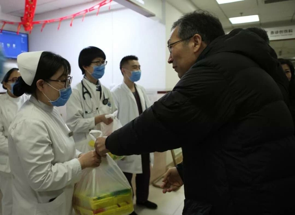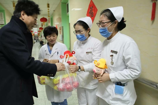 2019年2月4日晚,在萬家燈火的農(nóng)歷除夕夜,我院常務(wù)副院長(zhǎng)張?jiān)蕩X,副院長(zhǎng)史大卓、徐鳳芹、李浩,帶領(lǐng)職能處室負(fù)責(zé)人為節(jié)日期間堅(jiān)守工作崗位的值班人員送餃子,并向值班人員拜年,送上新春祝福和節(jié)日問候,讓職工們感受到來自醫(yī)院的濃濃情誼和家的溫暖。