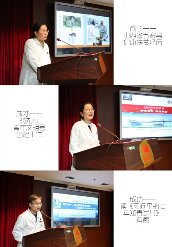 “成長-山西省五寨縣健康扶貧經(jīng)歷”、“成才-藥劑科青年文明號創(chuàng)建工作”、“成功—讀《習(xí)近平的七年知青歲月》有感”三個方面與大家進行交流。通過院領(lǐng)導(dǎo)的精彩點評,大家充分感受到無論任何階段,青年都應(yīng)該放寬眼界、拼搏進取、不忘初心、牢記使命、扛起時代的大旗,砥礪前行,為青春拼搏奮斗。