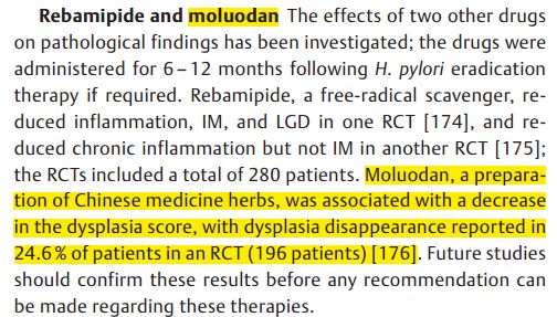 在MAPS Ⅱ治療部分引用了唯一一篇中醫(yī)藥研究:摩羅丹治療慢性萎縮性胃炎伴異型增生的隨機對照臨床試驗(2016年發(fā)表在Chin