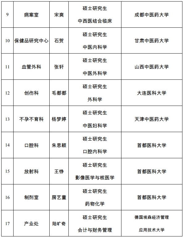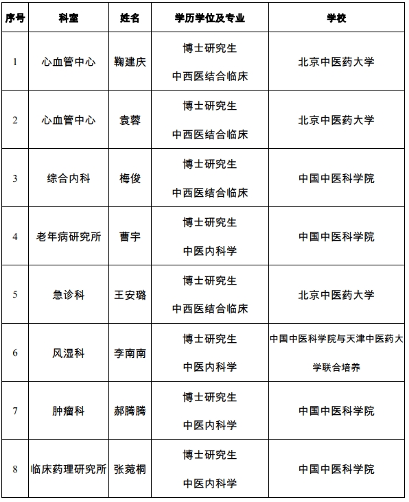 依據(jù)事業(yè)單位公開招聘工作有關(guān)規(guī)定,現(xiàn)將中國中醫(yī)科學(xué)院西苑醫(yī)院2019年擬聘用高校應(yīng)屆畢業(yè)生基本信息公示如下。公示期為7個工作日,公示期間,如有問題,請向我單位人事處或紀檢監(jiān)察處反映。