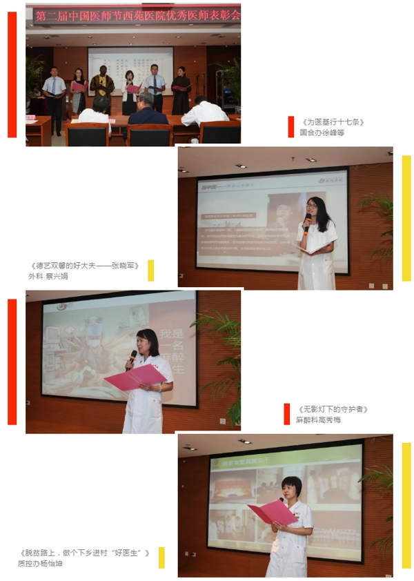 我院各位優(yōu)秀先進醫(yī)師所展示創(chuàng)院院訓及感人的先進典型故事,詮釋了一代代西苑人的優(yōu)秀品質,“仁心仁術,鑄就中醫(yī)之魂”、“克艱克難,力創(chuàng)名院首善”,這也不斷激勵鼓舞我院醫(yī)務工作者積極進取、奮發(fā)向上,再創(chuàng)西苑華彩新篇章。