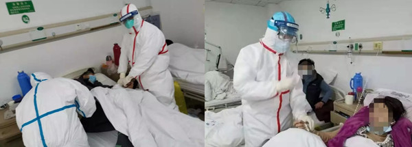 抵達(dá)武漢后,楊志旭了解情況后立刻進(jìn)入病房開展工作。一天查房時,有位患者突然要小便,楊志旭親自為患者接小便,用行動詮釋著“德不近佛者不可為醫(yī),術(shù)不近仙者不可為醫(yī)”的真諦。