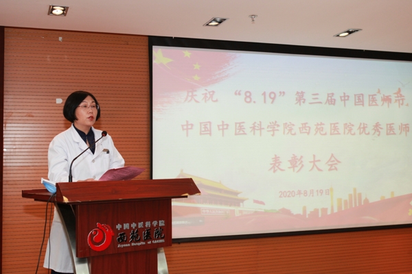 2020年8月19日,西苑醫(yī)院舉辦慶祝第三屆中國醫(yī)師節(jié)優(yōu)秀醫(yī)師表彰大會,對在抗擊疫情中發(fā)揮先鋒模范作用的先進(jìn)集體及個人進(jìn)行表彰。西苑醫(yī)院領(lǐng)導(dǎo)班子、中層干部、科室主任、援疆抗疫專家、扶貧干部及醫(yī)護(hù)代表等200余人在主會場或線上參會。會議由副院長徐鳳芹主持。