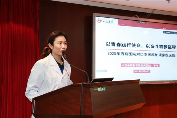 醫(yī)務(wù)青年理論學(xué)習(xí)小組李婧及心血管青年理論學(xué)習(xí)小組李圣耀,作為青年代表分享了他們在2020年參與健康扶貧和中醫(yī)藥海外抗疫的心得體會,講述了西苑醫(yī)院青年負(fù)責(zé)任、勇?lián)?dāng)?shù)那啻汗适隆?span lang="EN-US">