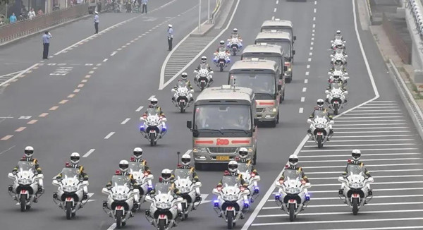 “七一勛章”獲得者集體乘坐禮賓車從住地出發(fā),由國賓護衛(wèi)隊護衛(wèi)前往人民大會堂。新華社記者 翟健嵐 攝