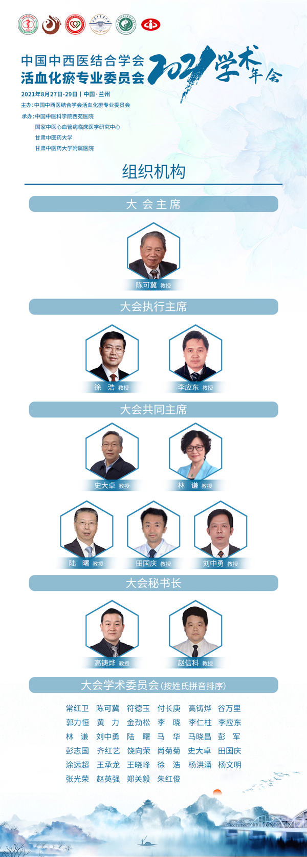 2021年8月27日至29日,由中國中西醫(yī)結(jié)合學(xué)會活血化瘀專業(yè)委員會主辦,中國中醫(yī)科學(xué)院西苑醫(yī)院、國家中醫(yī)心血管病臨床醫(yī)學(xué)研究中心,甘肅中醫(yī)藥大學(xué)及甘肅中醫(yī)藥大學(xué)附屬醫(yī)院承辦的中國中西醫(yī)結(jié)合學(xué)會活血化瘀專業(yè)委員會2021學(xué)術(shù)年會成功舉辦。按照國家疫情防控相關(guān)要求,本次大會采用線上與線下相結(jié)合的方式召開,為廣大參會者提供豐富現(xiàn)場與云端交流空間。此次會議由中國中醫(yī)科學(xué)院西苑醫(yī)院陳可冀院士擔(dān)任大會主席,徐浩教授、李應(yīng)東教授擔(dān)任大會執(zhí)行主席,并由史大卓教授、林謙教授、陸曙教授、田國慶教授、劉中勇教授擔(dān)任大會共同主席,由高鑄燁教授、趙信科教授擔(dān)任大會秘書長。