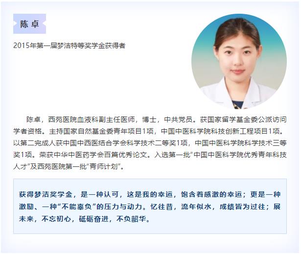 迄今,很多“夢(mèng)潔獎(jiǎng)學(xué)金”的獲獎(jiǎng)?wù)咭炎呱瞎ぷ鲘徫弧⒎e極活躍在臨床一線。他們“繼往圣之絕學(xué),為萬世開太平”,運(yùn)用自己所學(xué)知識(shí),矢志不渝地守護(hù)著廣大人民群眾的生命健康,守護(hù)人民幸福的生命線,用自己的光和熱,點(diǎn)亮了璀璨的萬家燈火,以堅(jiān)定的中醫(yī)藥文化自信和崇高的理想信念,磨礪專業(yè)技能,做人民守衛(wèi)健康的“長(zhǎng)城”。以下為幾位獲獎(jiǎng)杰出代表:
