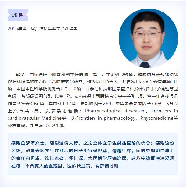 中國(guó)中醫(yī)科學(xué)院西苑醫(yī)院(以下簡(jiǎn)稱西苑醫(yī)院)自2015年起,緣遇了密切關(guān)注中醫(yī)藥文化事業(yè)發(fā)展的中醫(yī)藥文化愛好者魚夢(mèng)潔女士,魚夢(mèng)潔女士尤其關(guān)注博奧精深之中醫(yī)藥文化的傳承與賡續(xù),關(guān)心當(dāng)代中醫(yī)藥學(xué)子的岐黃成才之路,特出資設(shè)立西苑醫(yī)院“夢(mèng)潔獎(jiǎng)學(xué)金”,用于獎(jiǎng)勵(lì)中醫(yī)藥學(xué)習(xí)與研究中表現(xiàn)優(yōu)異的全日制研究生。目前西苑醫(yī)院“夢(mèng)潔獎(jiǎng)學(xué)金”評(píng)選已經(jīng)舉辦七屆,累計(jì)資助碩博研究生111人,在西苑醫(yī)院師生群體中產(chǎn)生了較好的激勵(lì)效應(yīng)及高認(rèn)可度?!皦?mèng)潔獎(jiǎng)學(xué)金”的設(shè)立,有助于培養(yǎng)出更多胸懷中國(guó)夢(mèng)、熱愛祖國(guó)傳統(tǒng)文化、砥礪奮進(jìn)、堅(jiān)定投身中醫(yī)藥事業(yè)傳承、守正創(chuàng)新的中醫(yī)青年,為新時(shí)代中醫(yī)藥文化事業(yè)培養(yǎng)更多、更優(yōu)質(zhì)的的接班人。