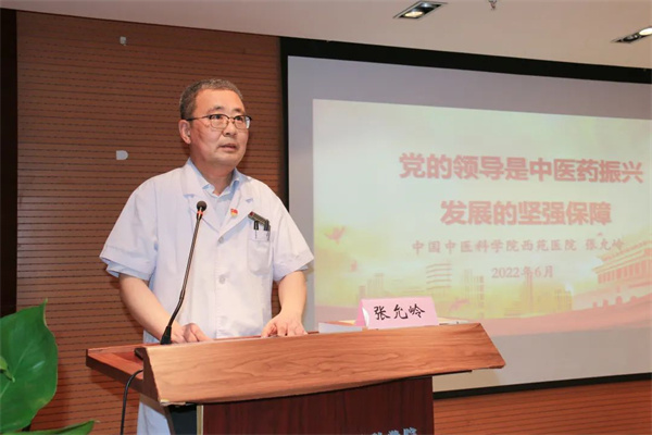 在專(zhuān)題黨課中,張?jiān)蕩X帶領(lǐng)大家一起回顧了黨領(lǐng)導(dǎo)中醫(yī)藥振興發(fā)展的歷程,重溫了習(xí)近平總書(shū)記致中國(guó)中醫(yī)科學(xué)院成立60周年的賀信,強(qiáng)調(diào)了推動(dòng)中醫(yī)藥振興發(fā)展要堅(jiān)持黨的領(lǐng)導(dǎo)、堅(jiān)持文化自信、堅(jiān)持守正創(chuàng)新。號(hào)召黨員干部職工在黨的領(lǐng)導(dǎo)下,攜手同心,為做大做強(qiáng)中國(guó)中醫(yī)科學(xué)院,將西苑醫(yī)院建設(shè)成為讓黨中央放心、讓人民群眾滿(mǎn)意的中醫(yī)院而不懈奮斗。