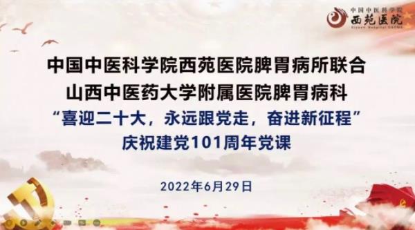 2022年6月29日,在中國共產(chǎn)黨成立101周年之際,我院脾胃病科黨支部聯(lián)合中國中醫(yī)科學(xué)院西苑醫(yī)院山西醫(yī)院脾胃病科,舉辦了“喜迎二十大,永遠(yuǎn)跟黨走,奮進(jìn)新征程”專題黨課,砥礪初心使命,強(qiáng)化擔(dān)當(dāng)作為。我院常駐山西醫(yī)院脾胃病科的呂林副主任擔(dān)任主持人,80余人線上參會。