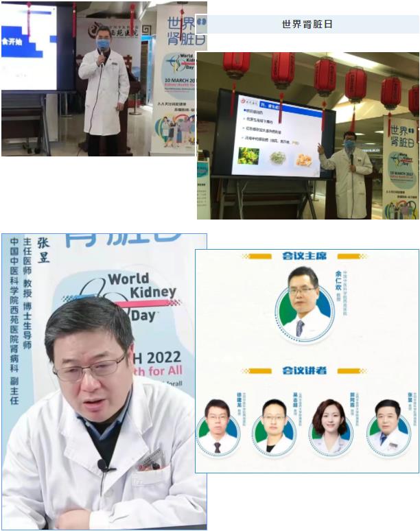 2022年3月10日是第17個(gè)世界腎臟日,今年世界腎臟日的主題是“人人關(guān)注腎臟健康-吾愛吾腎,知識(shí)強(qiáng)腎(Kidney Health for All-Bridge the knowledge gap to better kidney care)”。中國(guó)中醫(yī)科學(xué)院西苑醫(yī)院腎病科圍繞“吾愛吾腎,知識(shí)強(qiáng)腎”主題開展了一系列科普宣教活動(dòng)。 1.在線直播 3月10日上午10時(shí)在我院門診大廳,在做好疫情防控前提下,進(jìn)行現(xiàn)場(chǎng)科普講座,并同步線上直播。首先余仁歡主任以“呵護(hù)腎臟,從飲食開始”為主題,從“鹽、蛋白質(zhì)、發(fā)物、飲水、食療”五個(gè)方面介紹了腎臟病患者的飲食宜忌,強(qiáng)調(diào)通過改變飲食習(xí)慣,保護(hù)腎臟。其后徐建龍主任醫(yī)師就“合理治腎,科學(xué)護(hù)腎”,從“定期復(fù)查、合理飲食、避免感冒、避免勞累、標(biāo)本同治、避免藥物濫用”六個(gè)方面介紹了腎臟病患者治療中的注意事項(xiàng)。下午1點(diǎn)半張昱主任醫(yī)師就“腎病蛋…