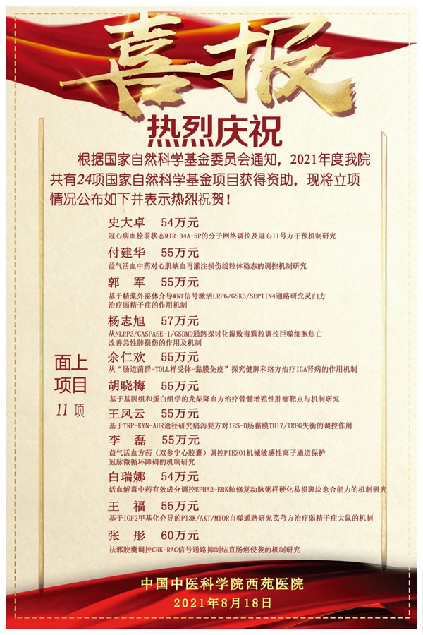 國家自然科學基金作為我國支持基礎(chǔ)研究的主渠道之一,因其相對穩(wěn)定的資助模式、不斷完善的審評標準、公開公平的審評程序,成為當前我國重要的國家級科研基金項目。 2021年是“十四五”的開局之年,院領(lǐng)導高度重視,深入系統(tǒng)謀劃,圍繞做大做強中國中醫(yī)科學院,研究分析面臨的形勢,部署2021年國家自然科學年基金的申報組織工作,為科研工作開好局、起好步奠定了堅實的基礎(chǔ)。 2021年,我院獲得國家自然科學基金資助24項,其中面上項目11項,青年科學基金項目13項,獲得資助經(jīng)費總計922萬元。項目申報數(shù)和立項數(shù)均取得歷史新高,立項數(shù)在中國中醫(yī)科學院四家醫(yī)院中名列第一名。這是我院科研人員刻苦鉆研與不懈努力的結(jié)果,在此向獲得資助的科研人員表示衷心的祝賀,希望大家只爭朝夕,不負韶華,全面貫徹科技創(chuàng)新引領(lǐng)高質(zhì)量發(fā)展的理念,讓西苑人…