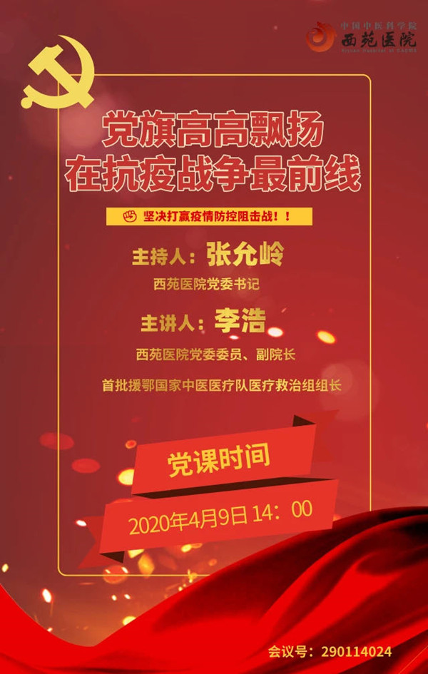 4月9日,西苑醫(yī)院黨委舉辦了一場專題“云黨課”,首批援鄂國家中醫(yī)醫(yī)療隊醫(yī)療組組長、西苑醫(yī)院黨委委員李浩副院長以《黨旗高高飄揚在抗疫戰(zhàn)爭最前線》為題講黨課。黨委書記張允嶺主持會議,黨委委員,院領(lǐng)導(dǎo),紀(jì)委委員,黨支部青年委員、紀(jì)檢員、入黨積極分子、發(fā)展對象、預(yù)備黨員,團委委員,青年理論學(xué)習(xí)小組成員等近300人共同在線學(xué)習(xí)。 李浩同志將理論與抗疫實踐相結(jié)合,從“我是黨員我先上,不是黨員也沖鋒”為切入點,回顧了醫(yī)療隊出發(fā)以來的深刻感悟。他談到,疫情就是集結(jié)號、疫情就是動員令,病毒無情、人間有愛,醫(yī)療隊員在抗疫一線的工作點滴及工作成效,彰顯了奉獻奮斗精神。不同歷史時期對黨員先鋒模范作用的發(fā)揮有著不同的要求,在此次抗擊疫情進程中更加深刻體會到:政治合格是根本的要求、執(zhí)行紀(jì)律合格是基本的底線、品…