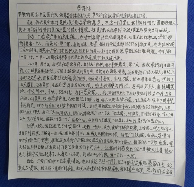 “主治醫(yī)生楊志旭每天都會根據(jù)我病情的變化改變我的中藥方子,讓我時刻感受到自己一直被關(guān)注著,信心足了,精神頭就起來了。從每天吃不完,到每天吃不飽,我一天比一天好?!? “謝曉磊,一位善良的母親,雖然穿著厚厚的防護(hù)服,帶著護(hù)目鏡,但我能從你的雙眸看到你美麗的笑容,我的心情也會跟著好起來。” “周振琪,一個呆萌的西紅柿,聲音特別甜,我猜人肯定也很美?!? “有一次廁所堵了,水漫到整個衛(wèi)生間都是,維修人員進(jìn)不來,護(hù)士搞不定,徐明拿起工具,關(guān)上廁所門,在滿是污漬的廁所獨(dú)自工作,沒一會就通了,臨走還用熱水把廁所沖洗干凈并消毒。” “一次,一位老人營養(yǎng)不良,手上血管幾乎看不到,蔣建新透過模糊的護(hù)目鏡,一針成功,老人連連說不疼,真是深藏不露。” “王剛家里的孩子還有兩個月就要降生,這是一個男人最…