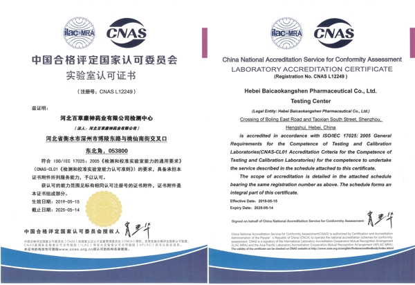 西苑醫(yī)院院辦企業(yè)——河北百草康神藥業(yè)有限公司檢測中心于2019年5月正式通過中國合格評定國家認可委員會(CNAS)的認可,證書編號:CNAS L 12249,順利成為CNAS認可實驗室。 CNAS認可證書 河北百草康神藥業(yè)有限公司始終堅持“一切以質(zhì)量為中心”的發(fā)展理念,秉承“科學(xué)嚴謹、客觀公正、操作規(guī)范、數(shù)據(jù)準(zhǔn)確”的質(zhì)量方針,質(zhì)量工作多年來常抓不懈。此次公司檢測中心通過CNAS認證,標(biāo)志著公司檢測中心的檢測能力和管理水平均踏上一個新的臺階。院辦企業(yè)將以更加嚴格的質(zhì)量管理,更精準(zhǔn)的數(shù)據(jù)檢測,保證我院中藥飲片質(zhì)量,為廣大患者提供放心可靠的中藥飲片。