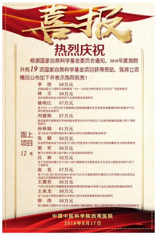 國家自然科學基金項目是面向全國資助自然科學中的基礎研究和應用基礎研究工作。因其相對穩(wěn)定的資助模式、不斷完善的審評標準、公開公平的審評程序,國家自然科學基金已成為當前我國影響力較大的國家級科研基金項目。獲得自然科學基金項目的多少是衡量一個單位科研能力和水平的重要指標,國家自然科學基金申請是中國中醫(yī)科學院西苑醫(yī)院科研項目管理工作中的重要環(huán)節(jié)。 青年科學基金是科研基礎,反映了單位人才儲備情況。面上項目是科研水平,體現(xiàn)一個單位整體的科研現(xiàn)狀。其他國家自然科學基金高級別項目是精品,突出科研機構研究水平的高度和影響力。 西苑醫(yī)院全體臨床和科研人員不斷追求醫(yī)療衛(wèi)生工作中的創(chuàng)新和發(fā)展,通過醫(yī)院領導的大力支持和科研人員的刻苦鉆研,我院在2018年度獲得國家自然科學基金資助19項,項目立項數(shù)和資助經(jīng)…