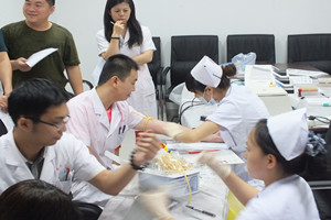 7月29日的北京悶熱異常,在西苑醫(yī)院急診科北通道里,一群人不到八點就開始忙碌上了。在院辦公室的組織調(diào)度下,院行政處、宣傳處、工會、門診部、急診科、輸血科等多部門聯(lián)合起來,各司其職,精心布置起一個臨時的獻血場所,很快將填表、體檢、采血、休息區(qū)劃分完畢,并在明顯的位置貼上了獻血宣傳畫和“中國中醫(yī)科學院西苑醫(yī)院”的紅色條幅。在門診大廳的電子顯示屏上,“向我院參加無償獻血的同志們學習致敬”幾個大字溫馨地閃爍著。八點半,報名獻血的同志陸續(xù)到來,領(lǐng)過號牌后坐在休息區(qū)等待獻血。 八點五十分,北京市中心血站的采血車如約到來,院長唐旭東來看望大家,并檢查獻血場地的布置情況。九點,在與血站工作人員交流以后,獻血活動有條不紊地進行著。大家按照號牌排隊,依次進行填表…